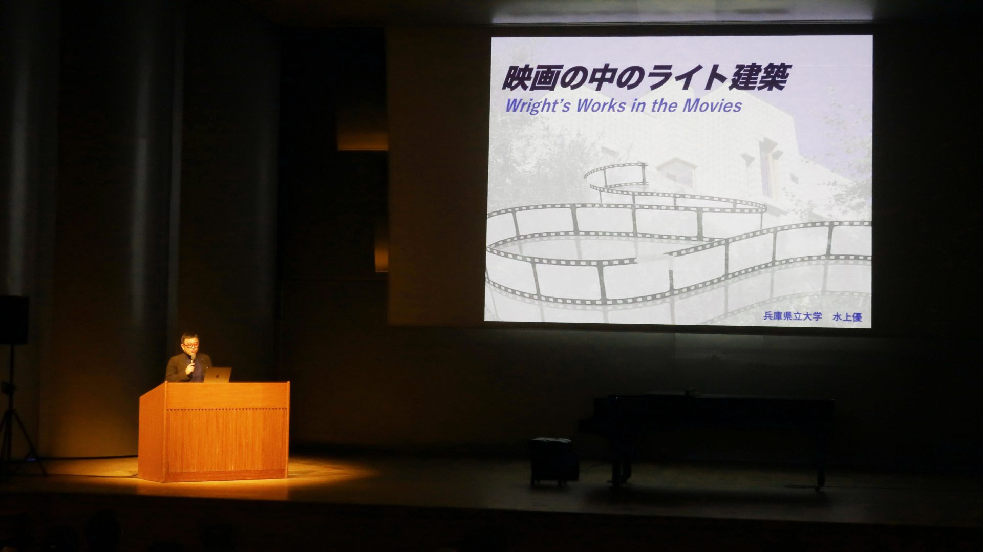 第一部では、ピアニストの宮本貴奈さんが「ライトが生きた時代のアメリカ音楽」等を演奏され、水上先生は「映画の中のライト建築」というテーマで、映画のシーンで使用されたグッゲンハイム美術館やエニス邸等を水上先生ならではの観点でとても面白可笑しくお話してくださいました。