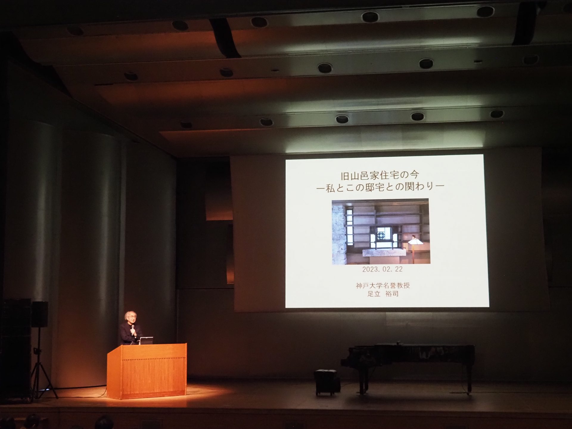 第二部では、安井建築設計事務所の佐野吉彦代表取締役社長が「芦屋川と建築」というテーマで芦屋のさまざまな建築を紹介され、足立先生は「旧山邑家住宅の今-私とこの邸宅の関わり-」というテーマで、当館の保存修理工事の歴史や意義について、先人たちの努力や思い等を交えて大変興味深いお話をしてくださり、最後に当館に課せられた今後の課題を提起されて講演を終えられました。