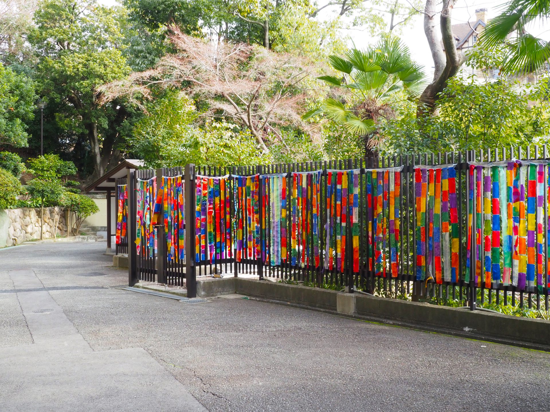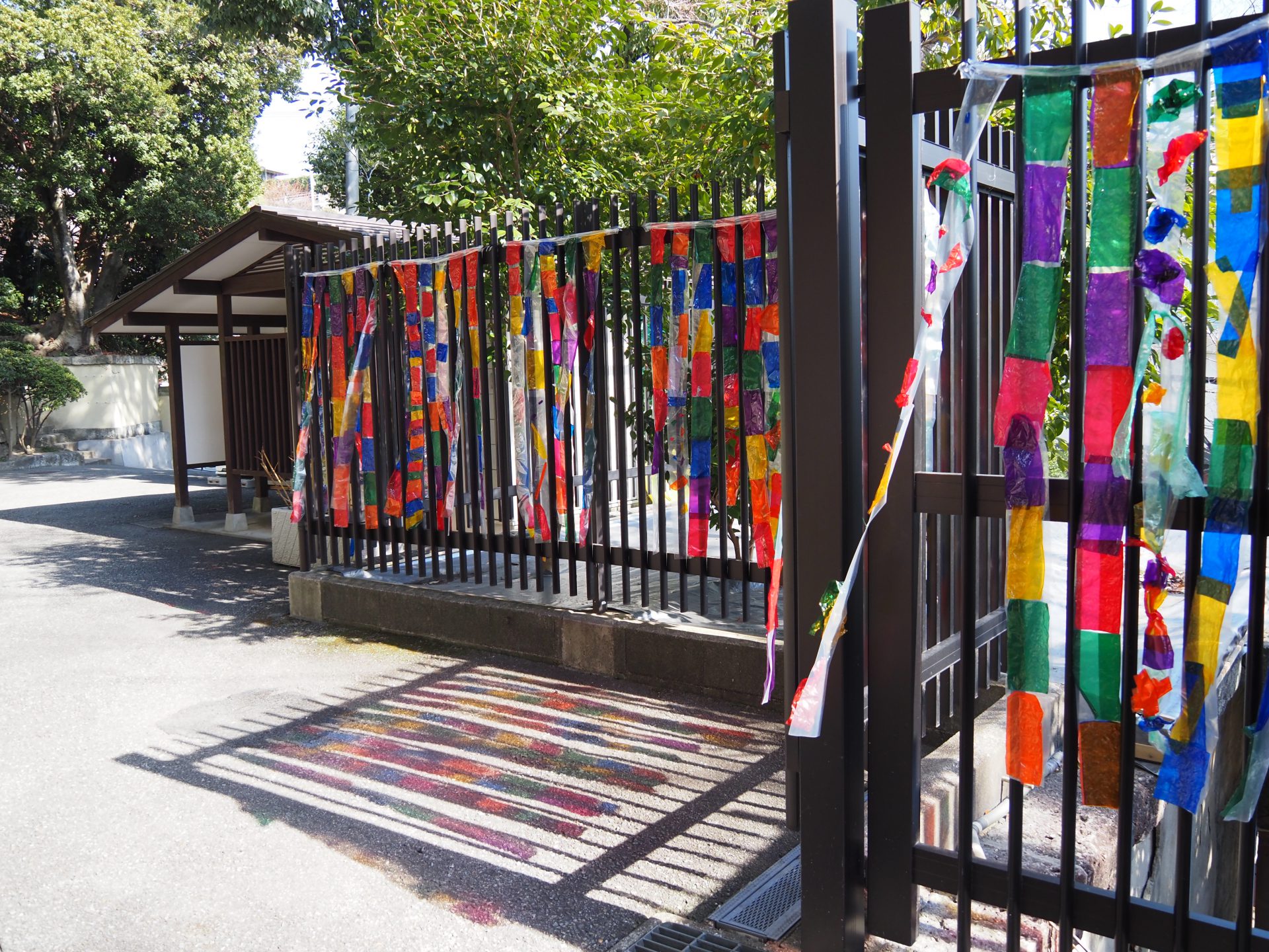 芦屋市立美術博物館の学芸員さんの特別授業により、子ども達が当館のアプローチをカラーセロハンで飾り、光と色のアートがご来館の方々を出迎えてくれました。フランク・ロイド・ライトの空間演出には、光も重要な役割を果たしています。今回の特別授業でライトの建築思想を学び、カラーセロハンを周りの緑と融合させることで、アプローチの空間をより美しく彩ってくれました。