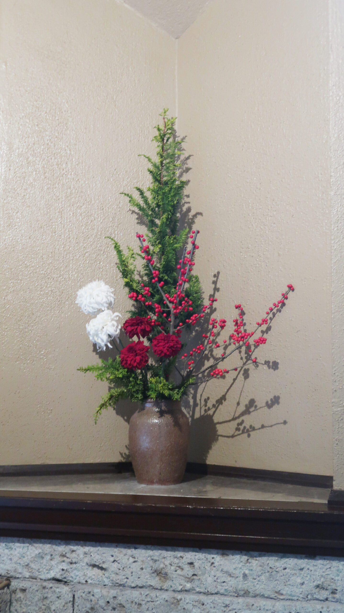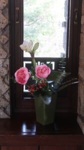 今年最後の生け込みは、季節の花々にクリスマスの彩りを添えました。