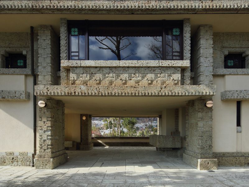 「ヨドコウ迎賓館」へのアプローチは、ライト独特のものです。道路から敷地に入った時に、すぐそこに玄関があるという一般的なアプローチと異なり、最も奥まったところに玄関が設けられています。
