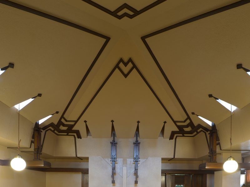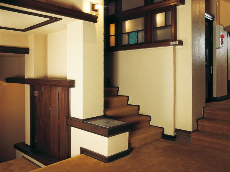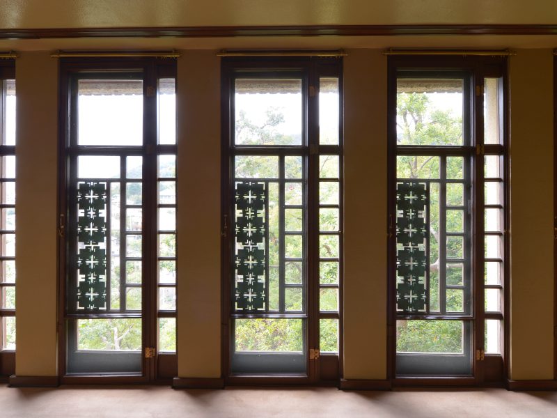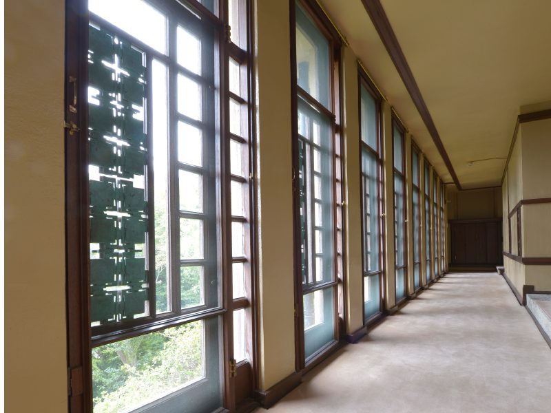 三階の長い廊下は、西側に並んだ足下までのびた大きなガラス窓によって、とても明るくなっています。窓は当時のアメリカではめずらしい外開きになっており、一般的だった上げ下げ窓をライトは採用しませんでした。これは自然に溶け込んだ建築を理想としたライトの、「室内を屋外と関連させ、外に向かって自由な開放を得るため」という考えからだったようです。