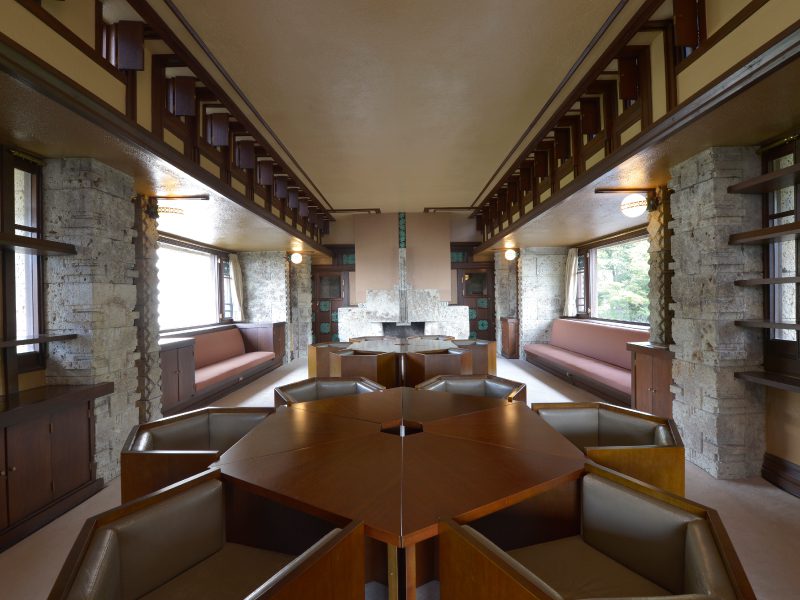 応接室の北側に大谷石で作られた大きな暖炉があります。ライトは「建物自体のどっしりした石積みの奥で、赤々と燃える炎を見つめるのは心安まるものである」と言っていますが、暖炉には強い思い入れがあったようです。