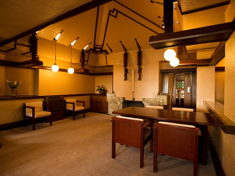 応接室の入口は、左右を装飾された暖炉や柱の大谷石にはさまれ、幅が約62cmと大変狭くなっています。この狭い入口を通って室内に入ると天井の高い広々とした空間が目の前に広がります。狭い入口はその次に来る広い空間を強調しており、ライトはこのような空間構成を他の作品でも好んで用いています。