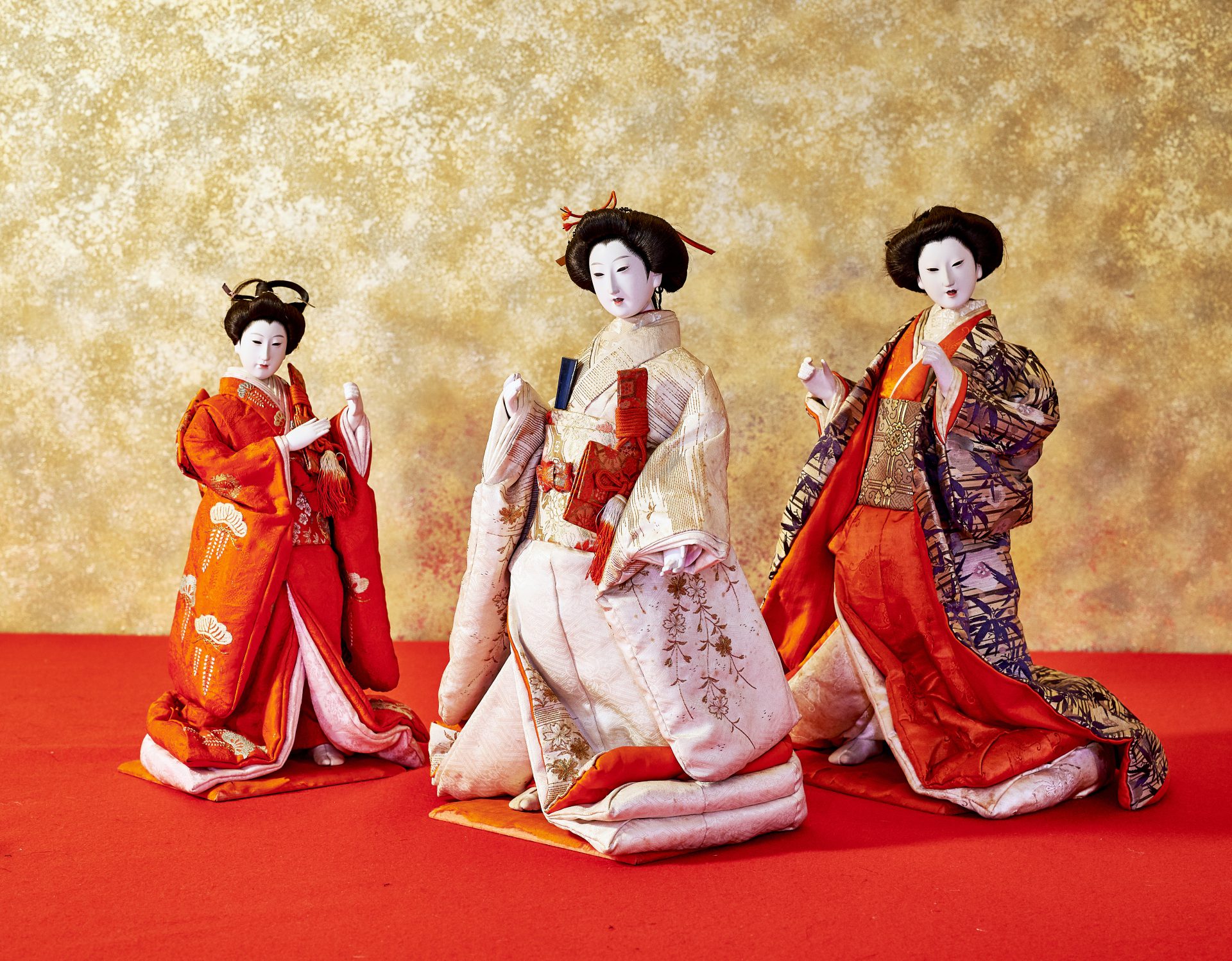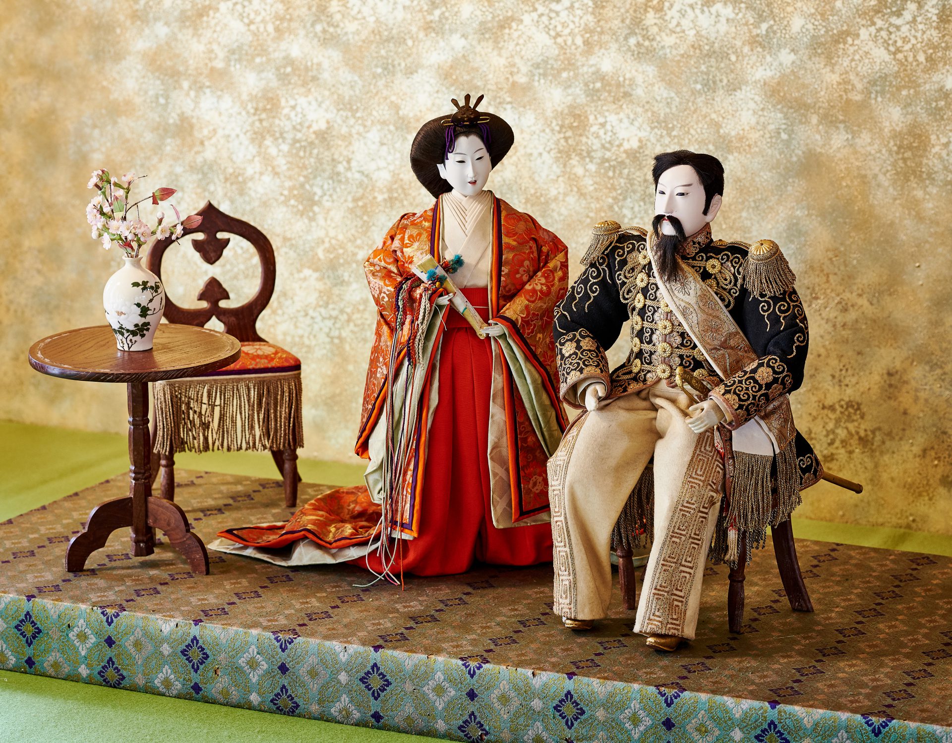 また、居稚児(いちご)やお福の趣向にした官女を配するなど独特の構成となっており、他にも花観人形の大礼服をまとった明治天皇に皇后(昭憲皇太后)の見立て雛など、100年以上の歳月を経た今も、優雅な顔立ち、豪華な衣装、細部にこだわった調度品など、時代を超えた美しさを持つ人形群です。