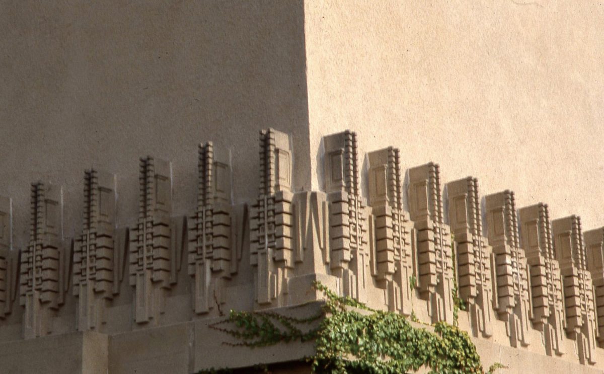 一方、カリフォルニア地域では、日差しの強い温帯地域であったことから、気候に即したデザインを展開した。それはおのずと草原住宅とは異なるもので、建築材料もコンクリートやコンクリートブロックが用いられた。カリフォルニア地域の代表作品の一つで、旧山邑邸との類似性が指摘されているバンズドール邸(1920年竣工)(※4)は、中庭型の住宅である。中庭側に大きな開口部を設け、内外の空間の連続性が意図されているものの、外観は陸屋根で開口部も小さな閉鎖的なデザインとなっている(写真3)。陸屋根は雨が少ない気候に対する処置、小さな開口部は熱の侵入を避けるための処置といえ、まさしく、気候風土に根差したデザインが展開されたのである。しかも、ホリホックハウス(立葵の家)の別名に象徴されるように、外壁には立葵をモチーフとした装飾が施され、立葵が群生する周囲環境との調和を目指したことがわかる(写真4)。