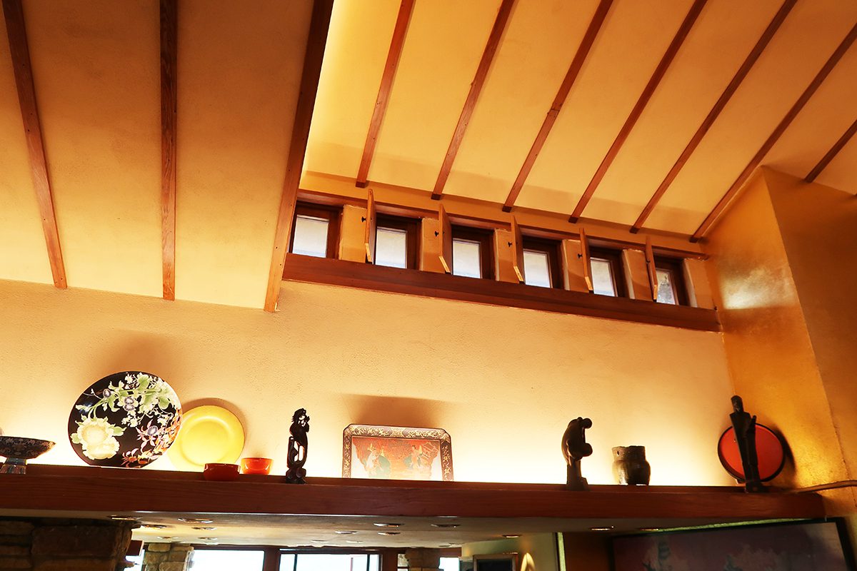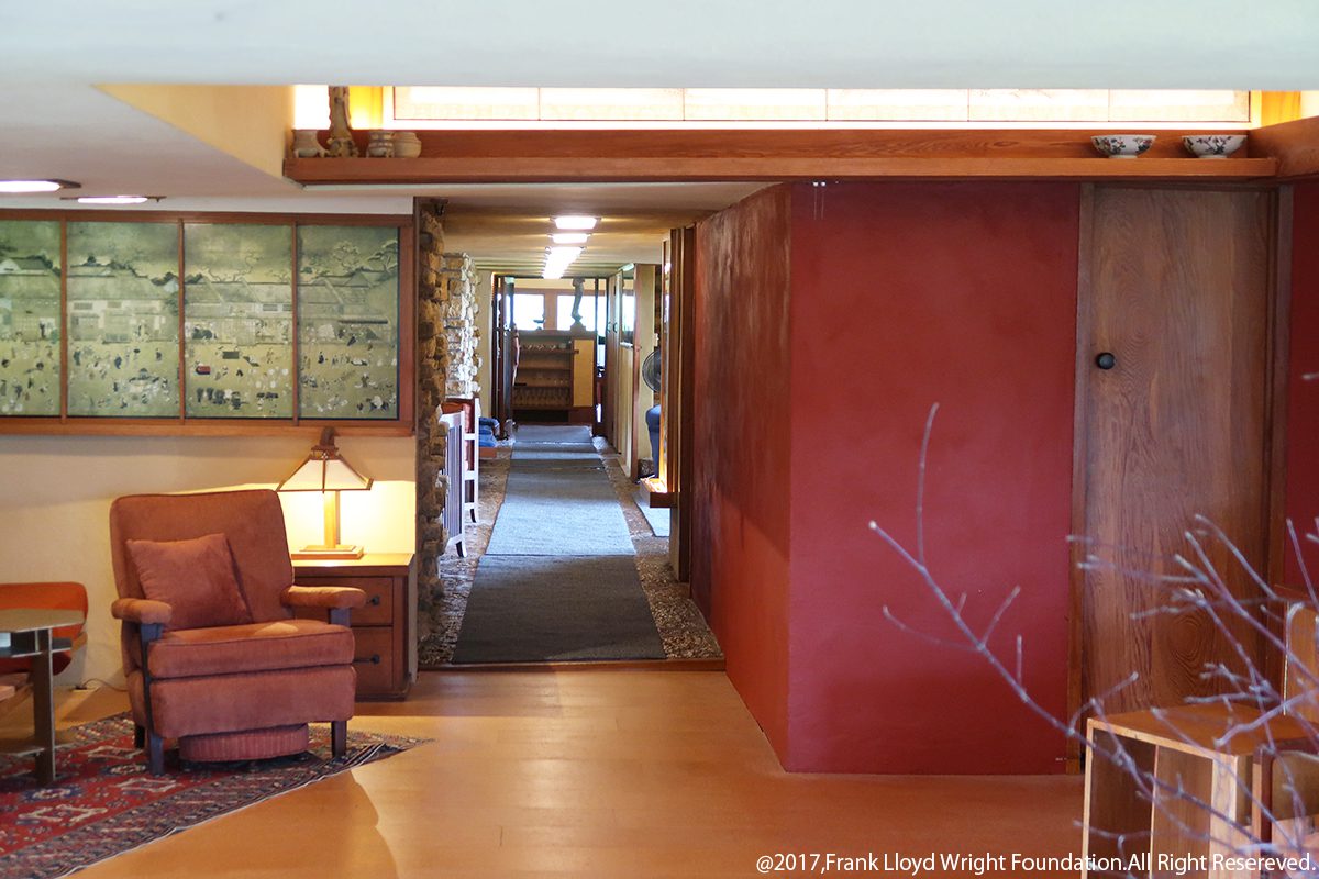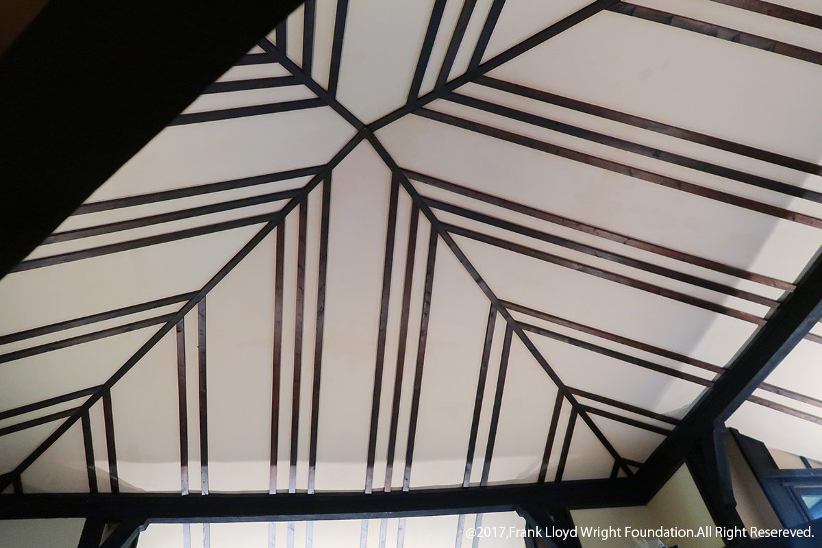 今回のツアーで見学した他の住宅でも、低く抑えた屋根と深い軒、狭い入口や低い天井から開放感のある部屋に続く構成などが、ライト建築における共通の特徴として見受けられました。