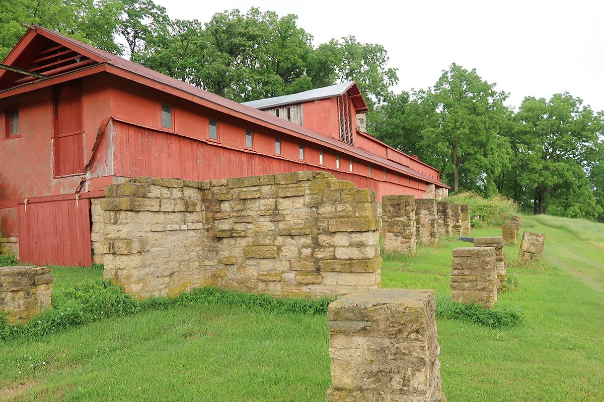 いくつかの石柱が残っている建物は、元々は屋根の続きで軒があり、その下には牛や馬を飼っていました。