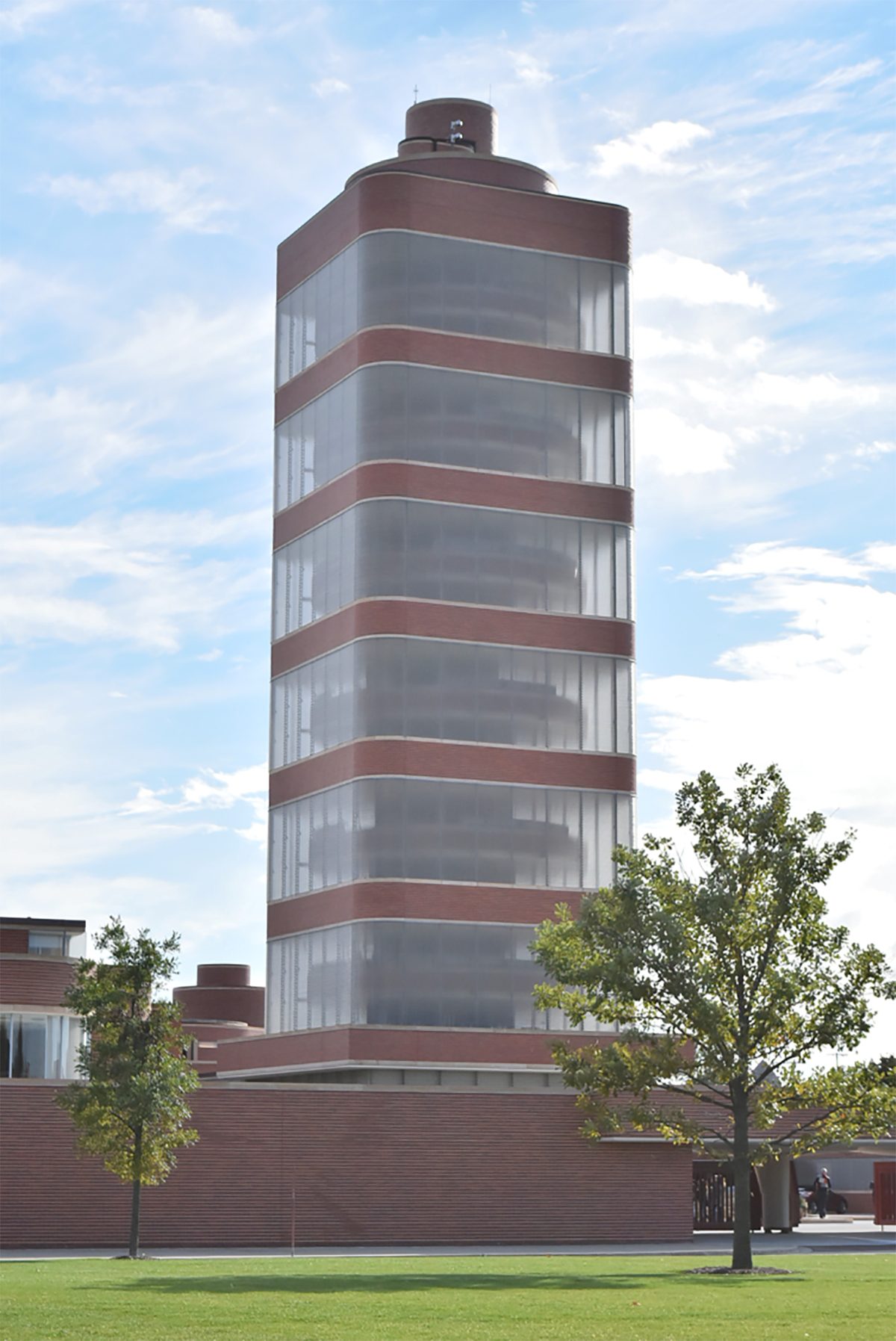 ウィスコンシン州ラシーンにあるジョンソン・ワックス本社ビルは以前から同社によって一般公開されていましたが、避難経路が中央シャフトの1箇所しかなく新たな法規に不適合となることから1982年より閉鎖されていた「リサーチタワー」(1944、写真3)も、1階に係員を常駐させることで2014年より一般公開されています。