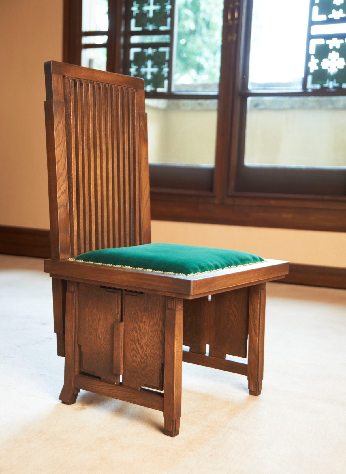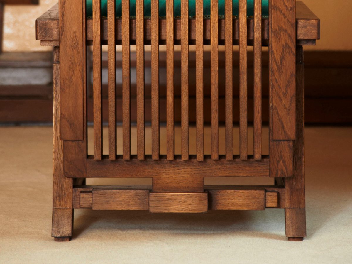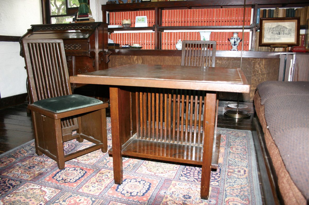 ライトの有機的建築を継承した遠藤新 はライトに出会う以前に、建築を「全一なる対象」と考えていた。大きくは都市・敷地の環境条件から、小さくは絨毯・家具・照明器具に至る全てを一体として、建築を考えていた。因みにライトのいう「有機的」というのは「一体化された統合性を意味するものであり、内発的なもの」である(フランク・ロイド・ライト「有機的建築」三輪直美訳)。この意味において、旧山邑家住宅にとって家具は重要な位置を占めている。家具は暮らし方を形にした室内空間(内発的)を構成する大きな要素であり、欠くことのできない存在である。つまり、建築と一体化して設計された家具は室内空間を決定付けるものであり、他の家具では意図された室内とは全く別の空間が現れることになる(写真1-1~3)。