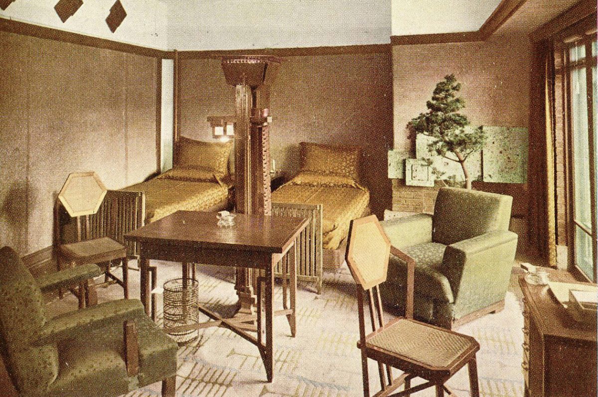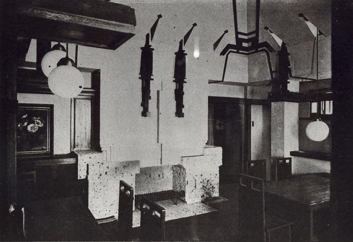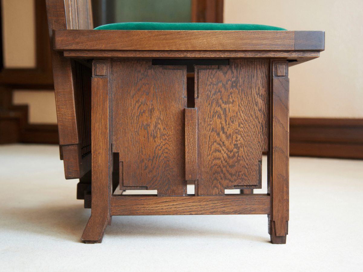 ライトの有機的建築を継承した遠藤新 はライトに出会う以前に、建築を「全一なる対象」と考えていた。大きくは都市・敷地の環境条件から、小さくは絨毯・家具・照明器具に至る全てを一体として、建築を考えていた。因みにライトのいう「有機的」というのは「一体化された統合性を意味するものであり、内発的なもの」である(フランク・ロイド・ライト「有機的建築」三輪直美訳)。この意味において、旧山邑家住宅にとって家具は重要な位置を占めている。家具は暮らし方を形にした室内空間(内発的)を構成する大きな要素であり、欠くことのできない存在である。つまり、建築と一体化して設計された家具は室内空間を決定付けるものであり、他の家具では意図された室内とは全く別の空間が現れることになる(写真1-1~3)。