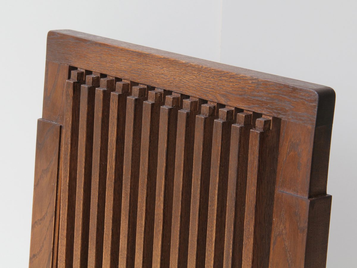 因みに、帝国ホテルの椅子とテーブル(写真7)については各部材が細く、幾分華奢な印象を受けるのに対して、旧山邑家住宅の机および小椅子については重厚な印象を与えるデザインが特徴となっている。