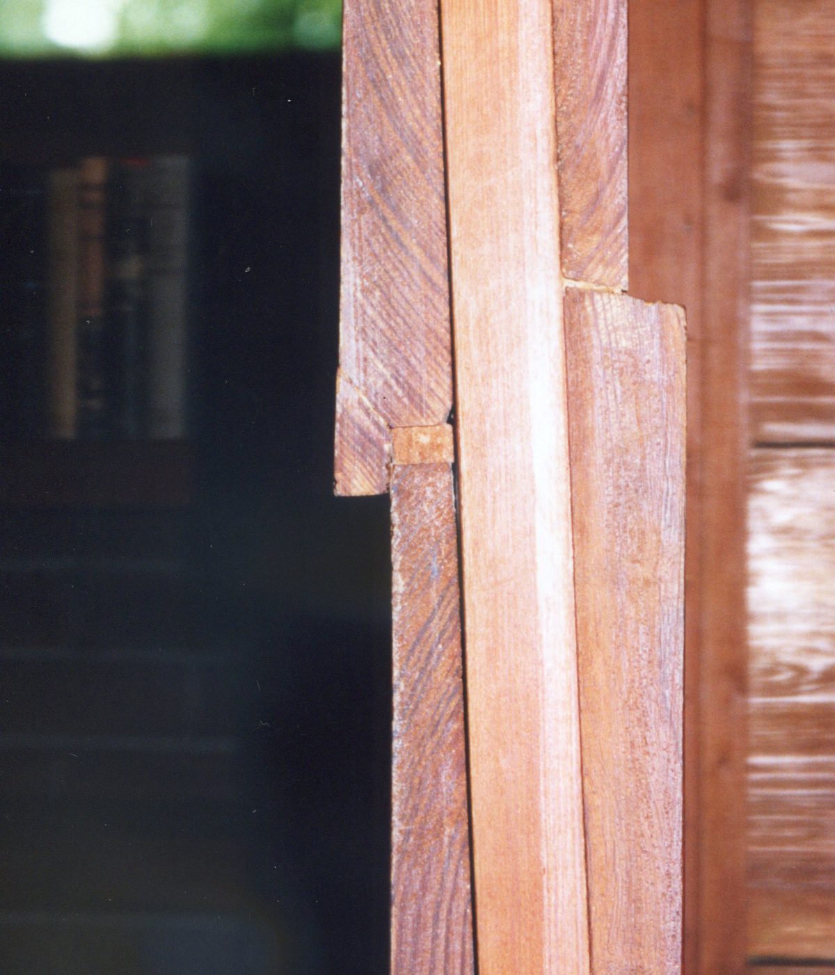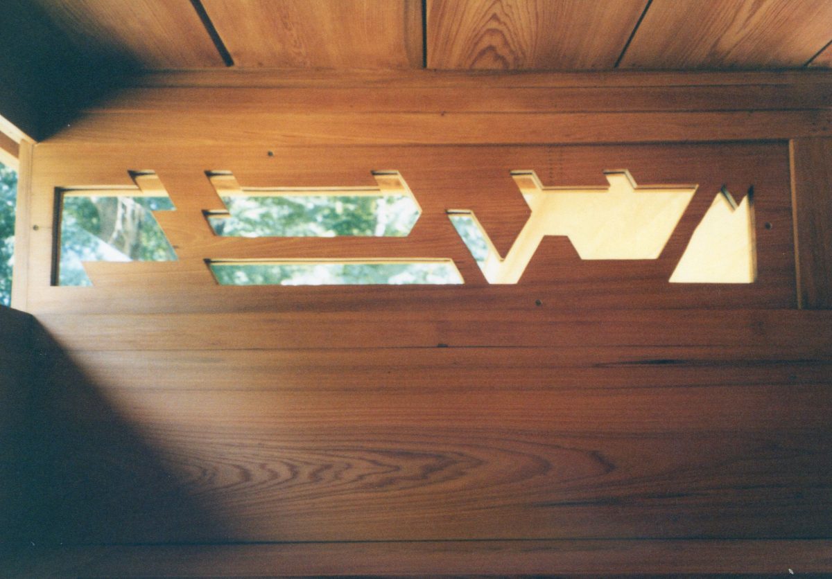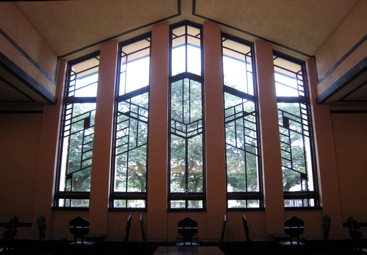 それまでのステンドグラスに替えて、窓には日本の欄間を思わせる幾何学模様をくり抜いた板材が取り付けられた。(写真2・3)それぞれの住宅ごとに違った模様のこの装飾は、デザインの美しさと経済的な施工の両立を意図したものであり、それに先駆けた自由学園 明日館でも、窓ガラスを細かく分割した意匠を見ることができる。(写真4)