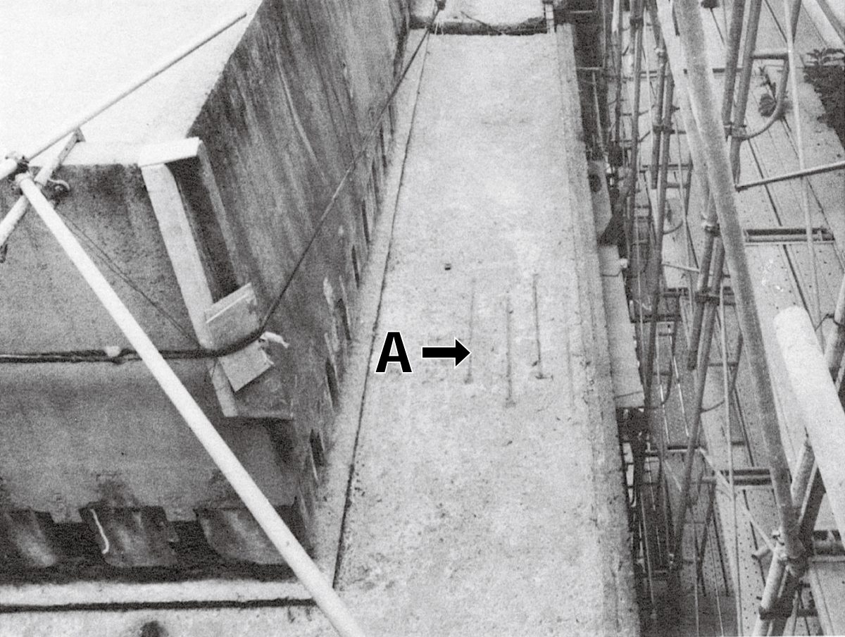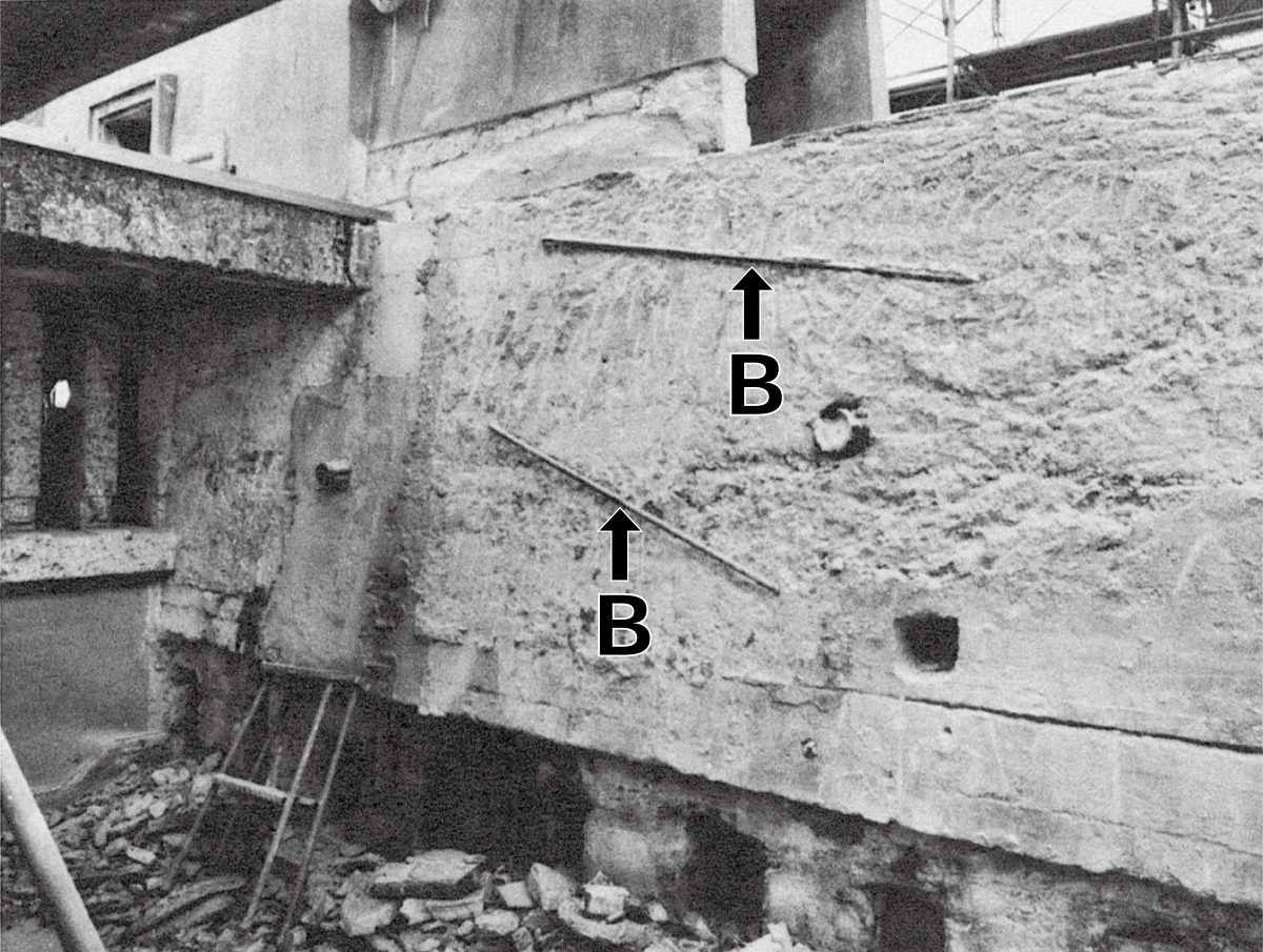 南棟の東西面の庇上面には、写真1の矢印Aに示すように亀裂を防止するための鉄製の鎹が数本ずつ打ち込まれていたので、念のために屋上パラペット(※1)の仕上げモルタルを除去したところ、写真2に示すように庇と同種の鎹(矢印B)による応急補強箇所が見つかった。亀裂の分布パターンは図1に示す通りであるが、これより南側の尾根筋からの迫り出し部分が、躯体工事完了後に崩れて大きく斜傾。先の庇やパラペットに大きな構造亀裂が発生したため、鎹で応急的に亀裂の進展を止めた後、左官で塗り込めたが、沈下したバルコニーなどは建て起こすことなく固定化されたようだ。