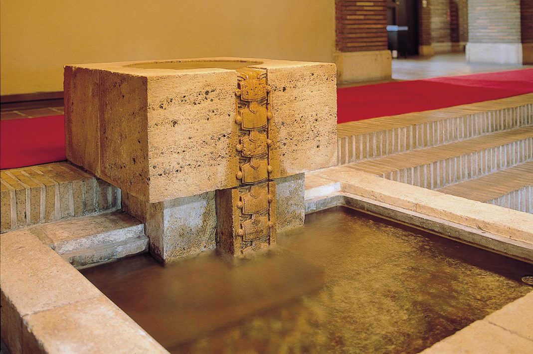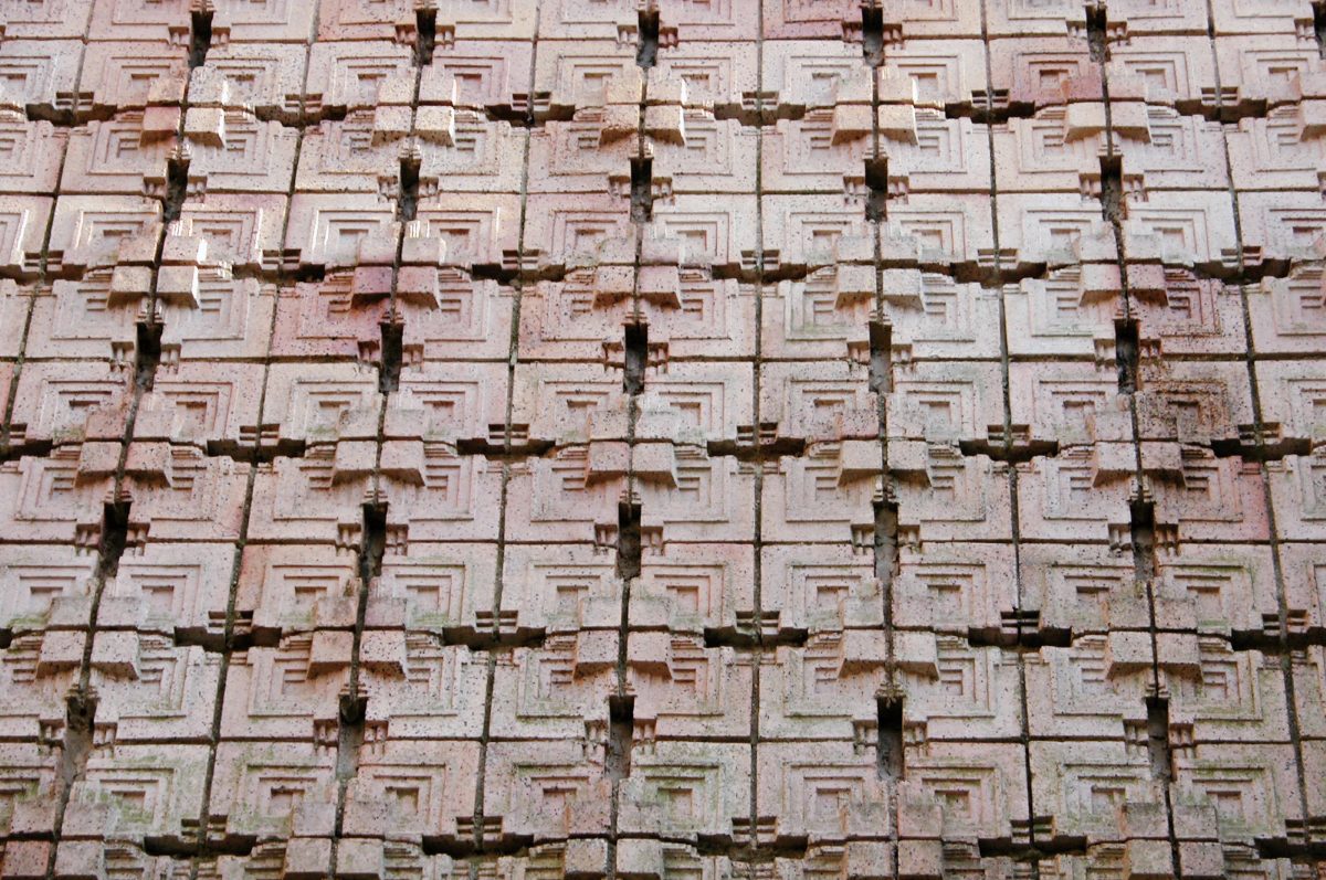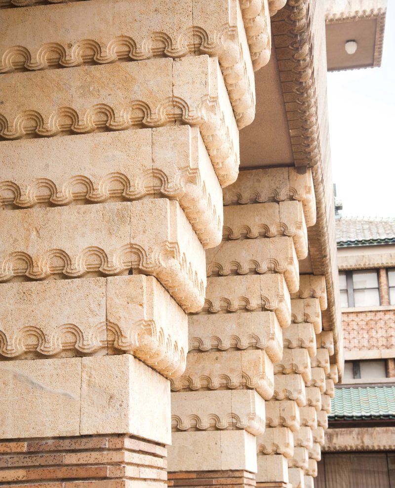 遠藤はライトの思想を受け継ぐ忠実な弟子だったと言われています。ライトが周囲の自然を抽象化した幾何学模様のデザインを建築の中に採り入れたように、遠藤も甲子園会館の壁面を覆う装飾タイルや日華石の彫刻に幾何学模様を採り入れています。また「打出の小槌」を主題にした装飾や緑釉瓦(りょくゆうがわら)(※3) 、西ホールの天井に見られる市松格子など、日本的な意匠が随所に取り入れられ、遠藤独自の世界が表現されています。