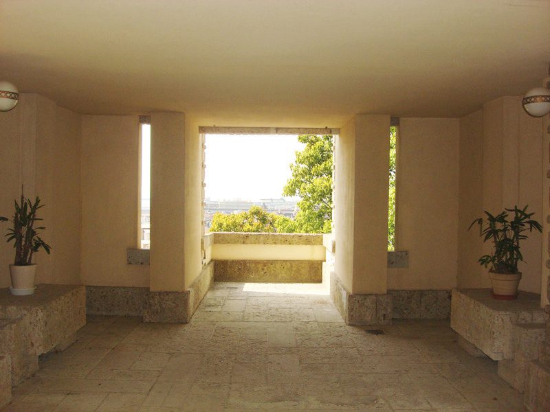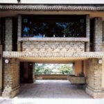 その理由は「内部と外部の一体化」を重視した彼の建築思想にあると考えます。1階の車寄せはフラットな天井と柱に囲まれており、すっきりと周囲の景色が見通せます。つまり天井をフラットにすることで視線を外へ外へと導き、内にいながら外との関係を意識させているのでしょう。ライトの代表作である「落水荘」(米国ペンシルベニア州)も同様に低く水平な天井をもち、大きなガラス窓から視線が外に向くように造られています。