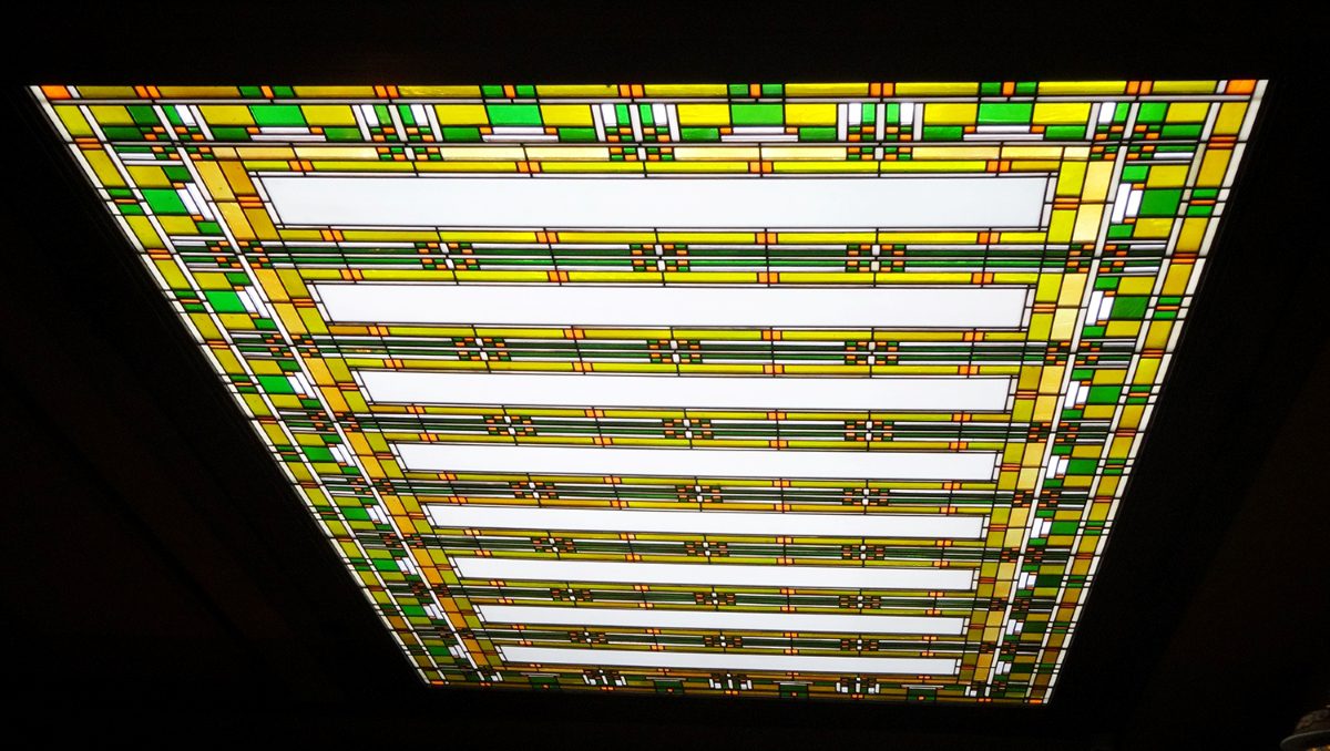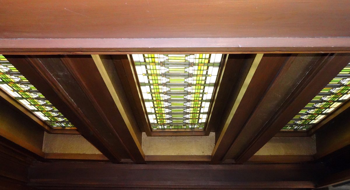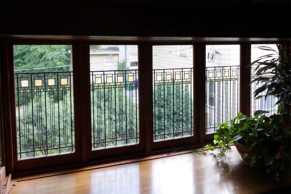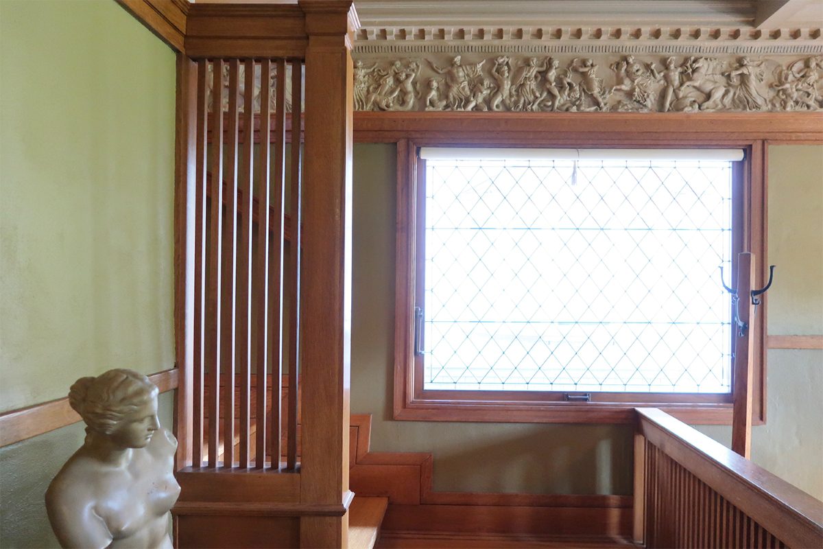 天窓には美しい装飾が施されています。入口の天井もそうでしたが、この家には植物をモチーフにしたようなデザインが多くあります。このあたりは、ライトの師であるサリヴァンの影響なのかもしれません。