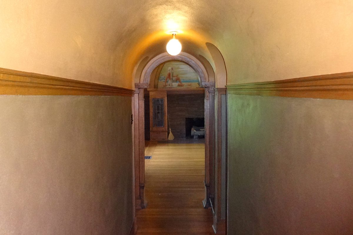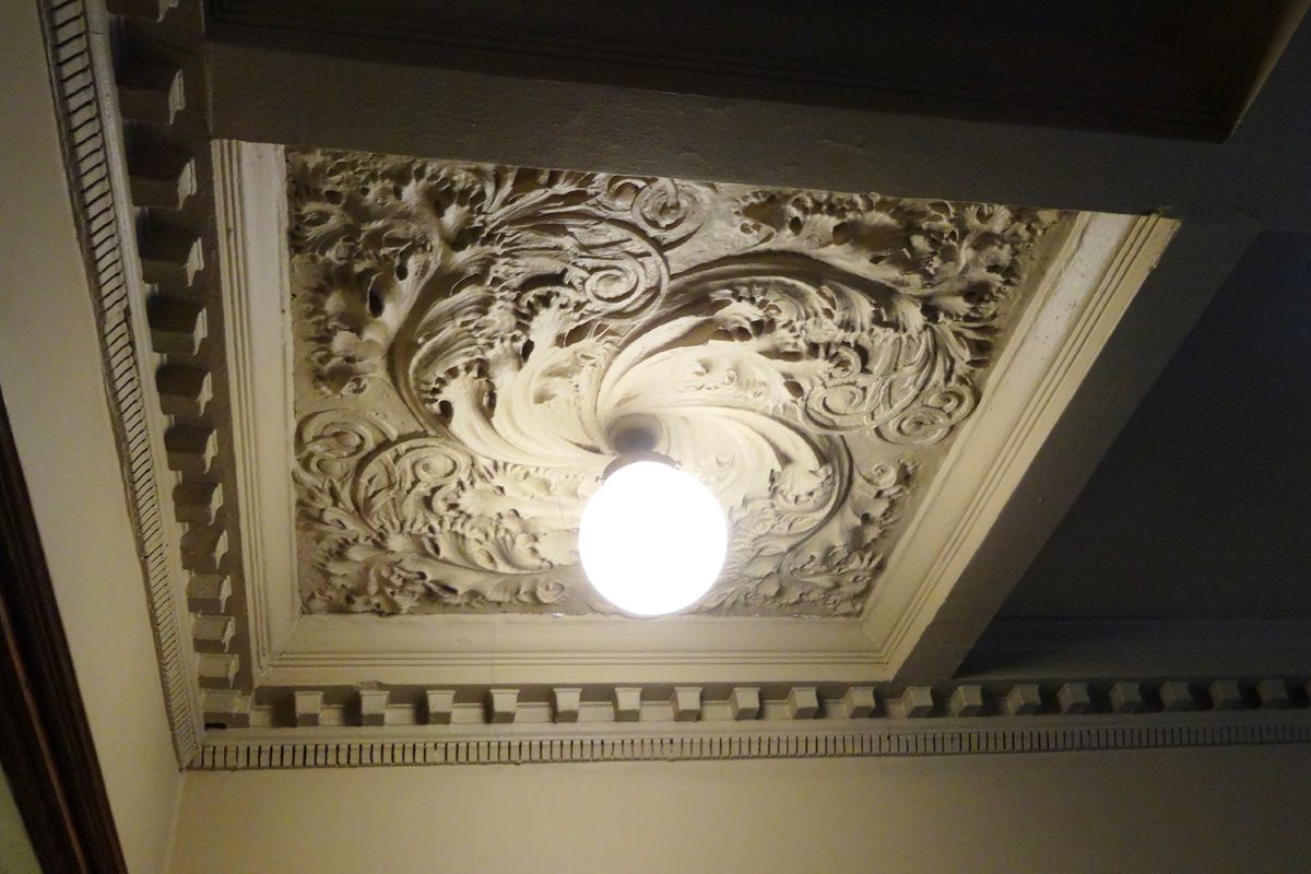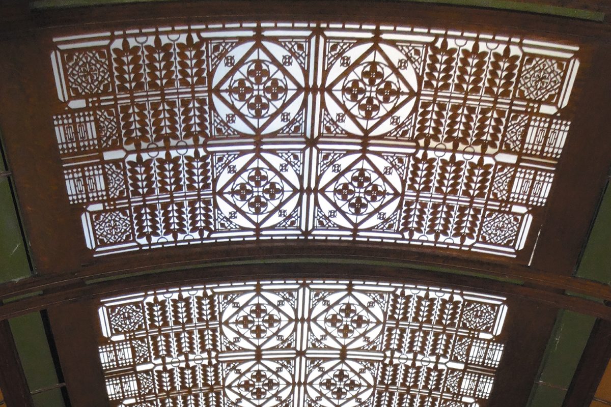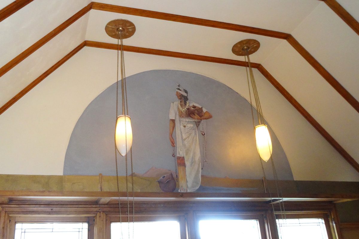 天窓には美しい装飾が施されています。入口の天井もそうでしたが、この家には植物をモチーフにしたようなデザインが多くあります。このあたりは、ライトの師であるサリヴァンの影響なのかもしれません。