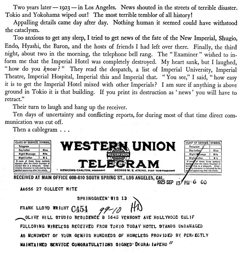 Frank Lloyd Wrigh,.-An Autobiography, 1932, Longmans, Green&Co., P.221・222。 同書のP.222後半部分には電報会社から 配達された送達紙も掲載されている。