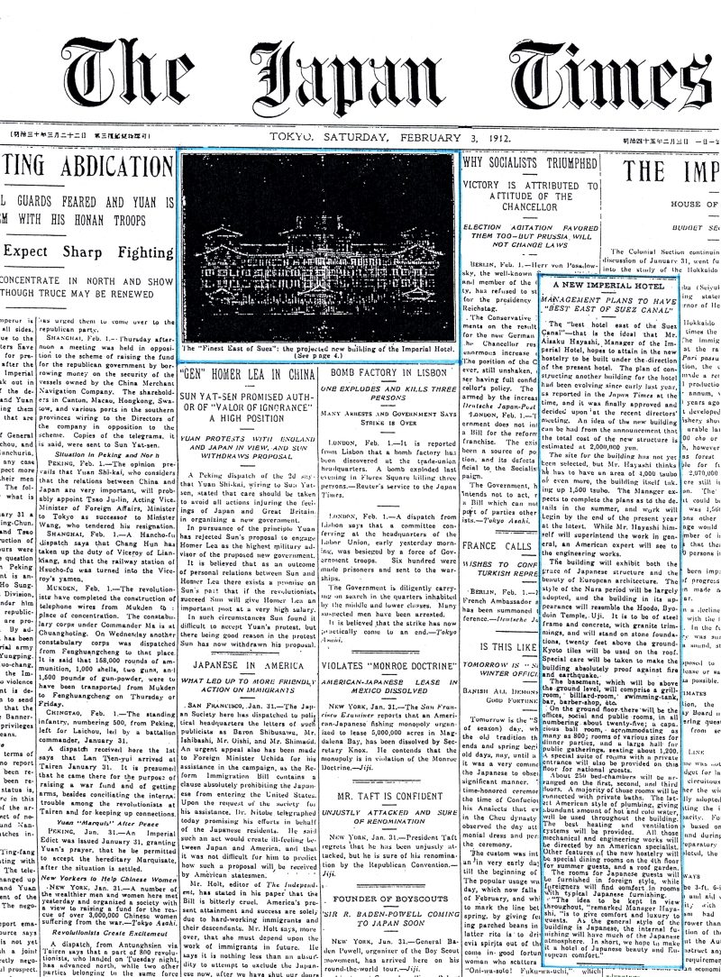 The Japan Times 1912年2月3日付、1面と4面に新ホテルの正面図を添えて、林愛作支配人が解説した記事。(設計者が下田であることは明記されていない)