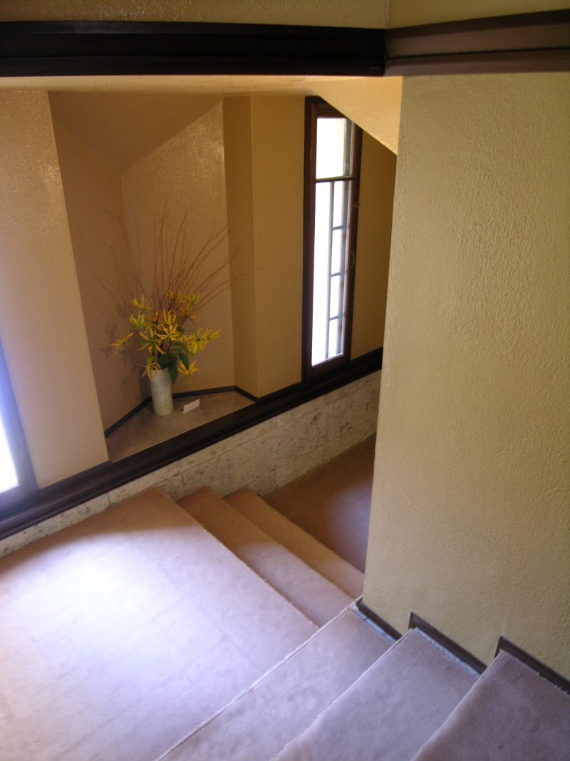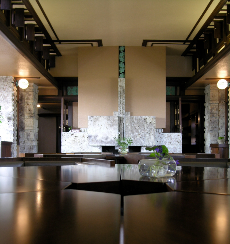 いくつもの手法を束ね、丁寧な筆致で、その建物が建つ場所にふさわしい建築を描ききること。ここにライトの並外れた能力があります。近代建築の主流は、むしろ手法を最小限に切り詰めて、文字通りの単純性を目指しました。そしてついには、装飾を施すこと自体が罪であり、時代遅れであるかのような気分が作り上げられていったのです。ライトの作品でも、初期のアートガラスのような華麗な装飾は、確かに減っていきます。しかし、モールディング、エッジ、テクスチャーの3つの手法はずっと残ります。これらが個々の部屋を飾り立てるための単なる装飾ではなく、建物全体の空間構成を豊かに造形し、表現する道具だったからです。