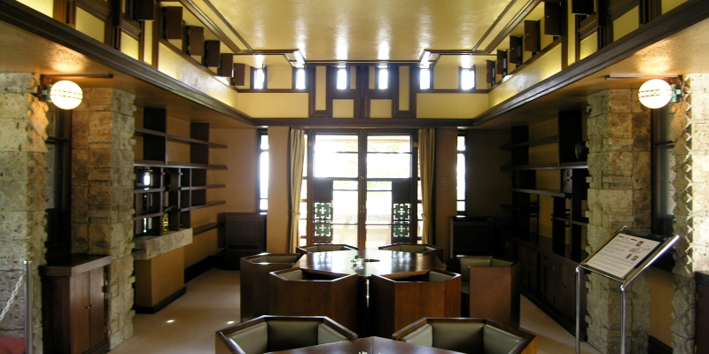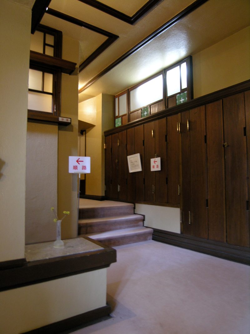 しかしこれらは、いわば手がかりに過ぎません。建築とは結局のところ、大地に人間が暮らす場所=空間を形づくる芸術ですから、細部の手法の背後には、ライト独特の空間のとらえかたや意図が隠されているはずなのです。ヨドコウ迎賓館(旧山邑家住宅)の竣工した1924年は、ライトのキャリアのほぼ中間点、転換点にあたります。初期の手法を色濃く残しつつ、後半生の創造の予感が漂います。この貴重な作品を歩いて、ライト独特の細部の手法が、いかなる空間的効果を醸し出しているのか、観察していくことにしましょう。