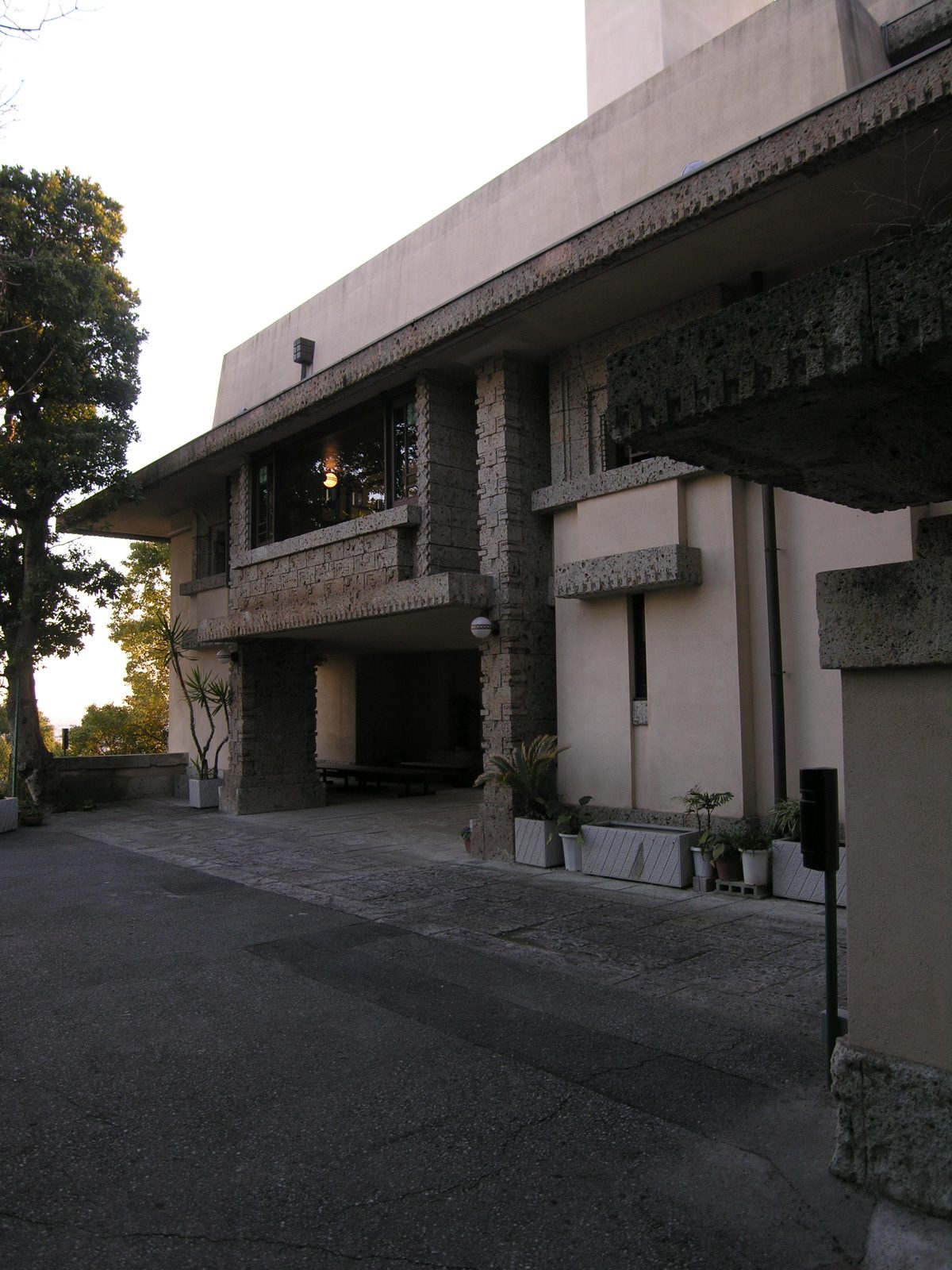 いかにも芦屋らしい坂を登り、門を抜け、さらに逆向きにしばらく登ると、建物の横顔が見えてきます。テクスチャーは、荒々しい大谷石と、滑らかな塗り壁。触感の大きく異なる素材を組み合わせることによって色彩をが同系色にまとめられています。初期のプレイリーハウスよりも、洗練され、抑制された表情に落ち着きます。