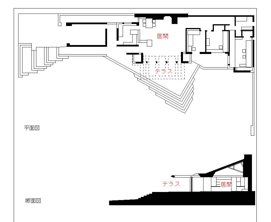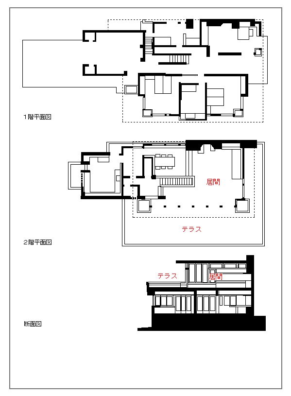 - (註)ユーソニアン・ハウスでも、河川氾濫への対処を念頭に置いたロイド・ルイス邸(1939)は例外である。また敷地の形状によってテラスがキャンティレヴァーとなる場合には、当然その外縁に腰壁がつく。しかしその場合にも居間はエントランスと同レベルであって、プレイリー・ハウスのように居間が「階段」によっていわば地上から切り離されることはない。そして「大地に平行な面」であると言われるように、ユーソニアン・ハウスのキャンティレバーは「大地」との連続性において捉えられている。