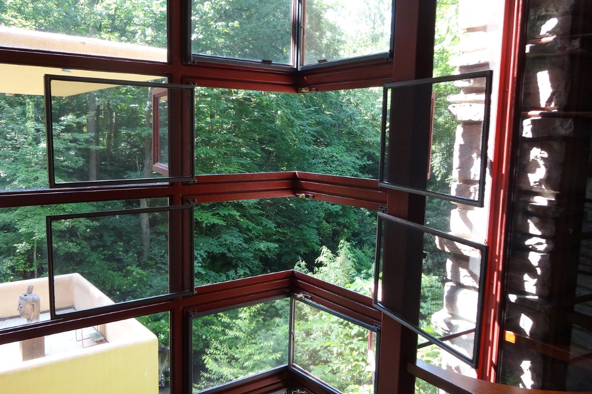 手荷物を備え付けのロッカーに預け、3班に分かれてツアー開始。ガイドはもちろん英語ですので、ツアーナビゲーターの遠藤さんと添乗員の方に加え、参加者の中で英語の堪能な方に通訳をしていただきました。この建物は、デパートのオーナーであるカウフマン氏の別荘として建てられました。1937年の完成ですので、ヨドコウ迎賓館が竣工した13年後になります。
