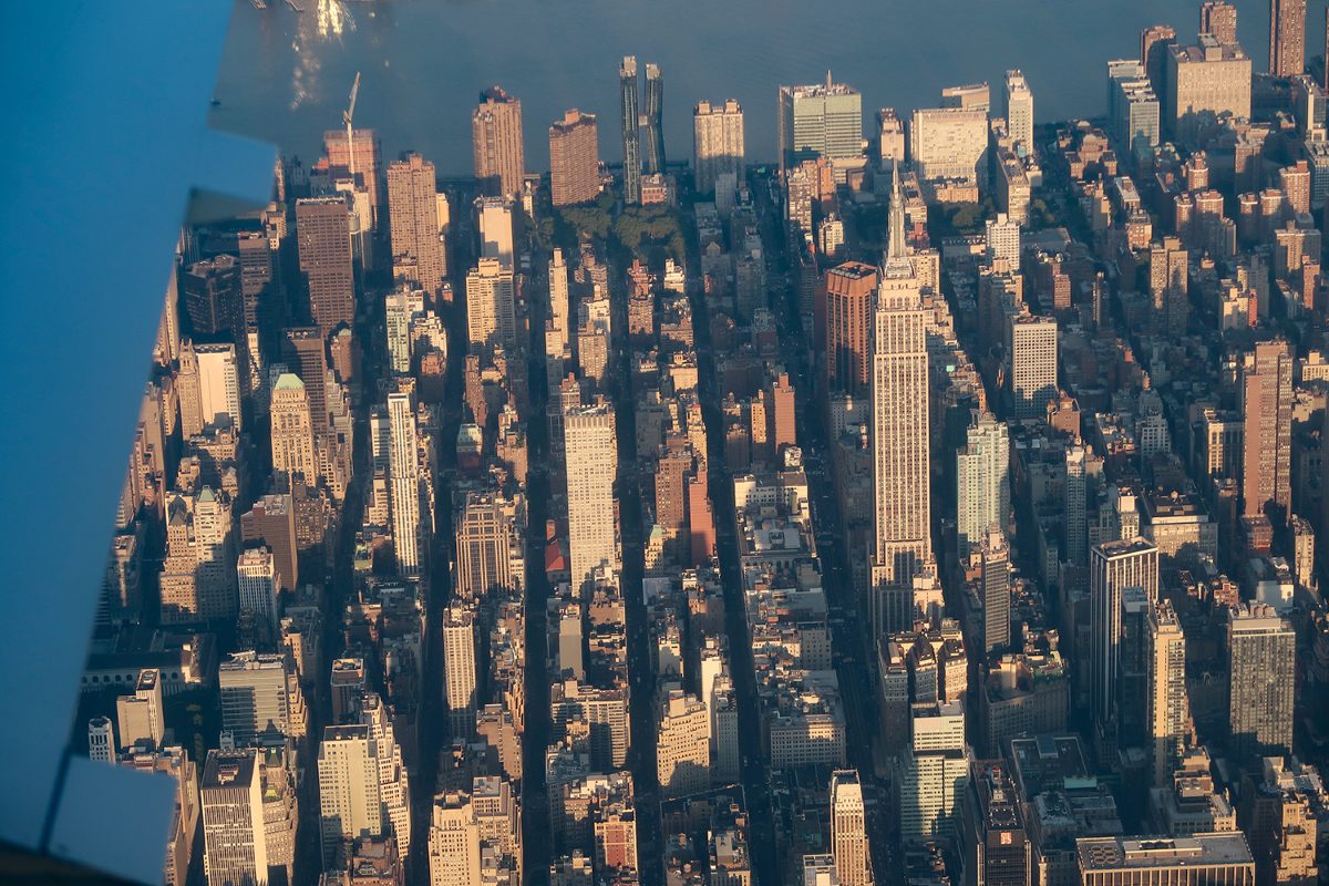 写真は、飛行機から撮影した夕日に染まるマンハッタンです。