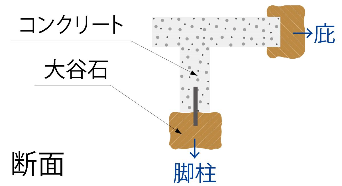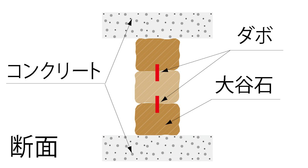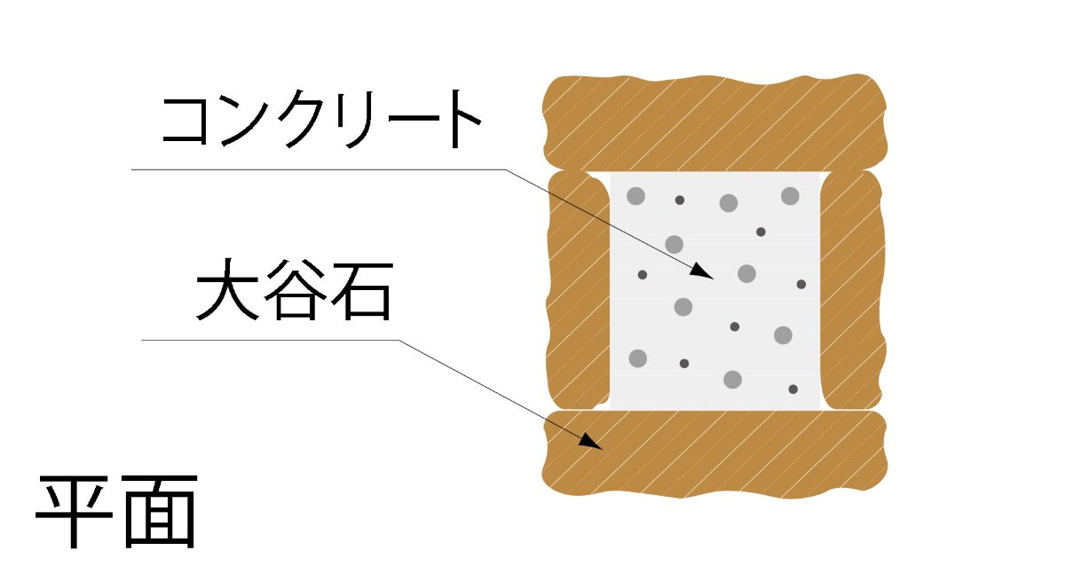 簡単にまとめると、石を型枠代わり(本来は木板を使用)にしてコンクリートを充塡。石とコンクリートを一体化することによって脆さを補強し、石はそのまま意匠として残してあるのです。(下記参照)