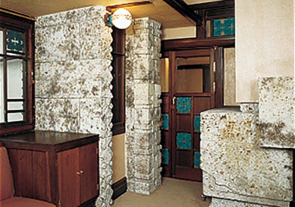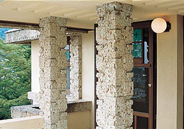 そして、従来とは全く異なる補強工法を考案してまで使用したかった石材こそ、日本におけるライト建築の特徴と言われる大谷石(おおやいし)(※2)なのです。ライトは、構造の軸となる柱などにも大谷石を使用し、彼独特の幾何学的装飾模様を刻み込むことによって、独自の意匠を徹底的にアピールしたかったのではないでしょうか。