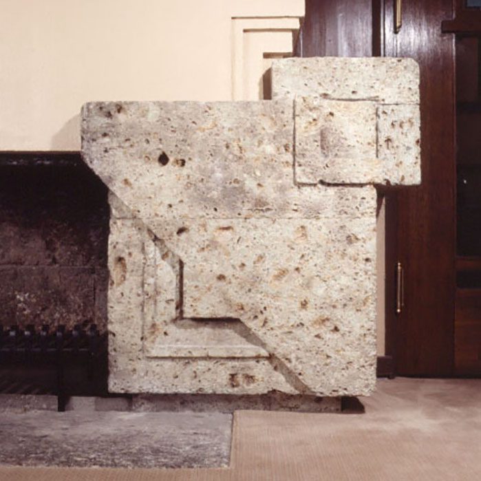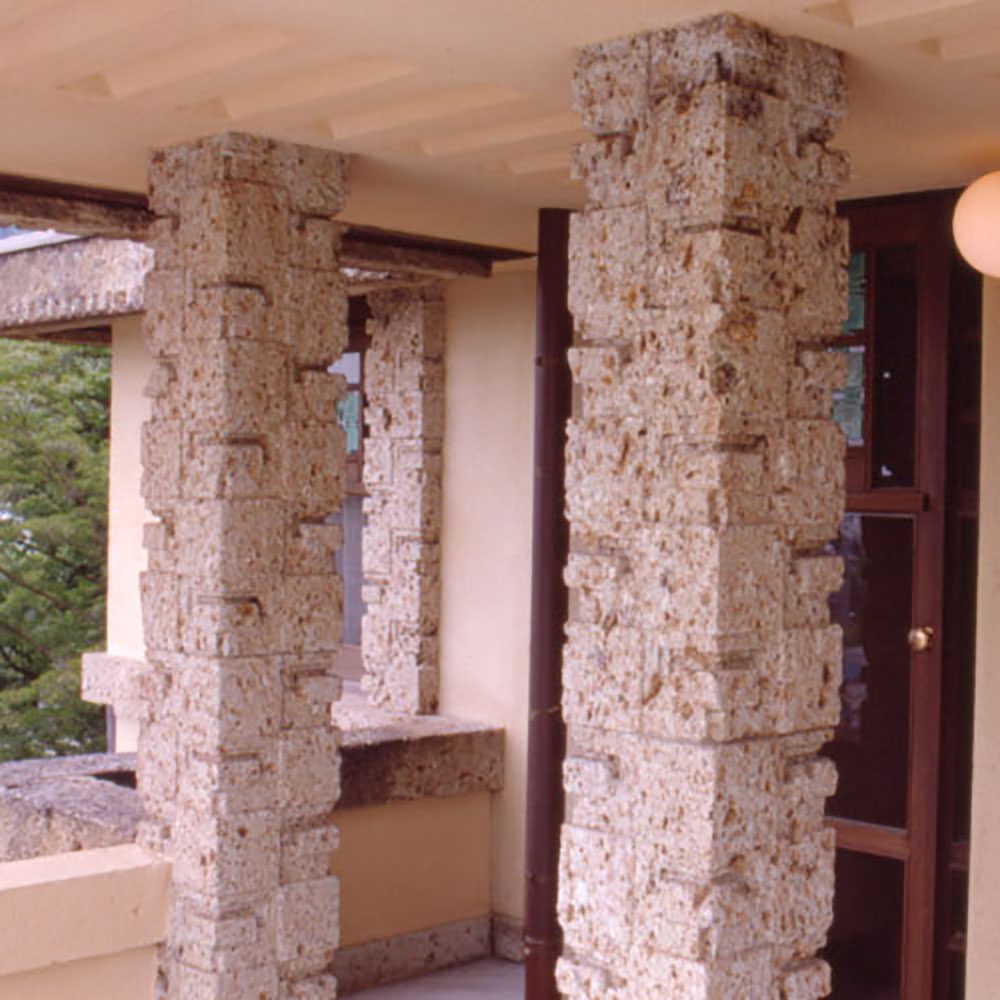 ヨドコウ迎賓館に来館された方のご質問で特に多いのが、内外装に使われている石材は何かということ。この石材「大谷石」(おおやいし)と呼ばれ、栃木県宇都宮市大谷町一帯で採掘されています。大谷石といえば、同じライト作品として名高い旧帝国ホテルにも使用され、日本に於けるライト建築を特徴づけるものといわれています。実は、当初検討していたのは、大谷石ではなく、よく似た島根県産の「蜂の巣石」だったとか。しかし、産出量が少ないため断念したようです。それはともかく、ライトはなぜ大谷石に決定したのでしょう?その理由を解明してみたいと思います。