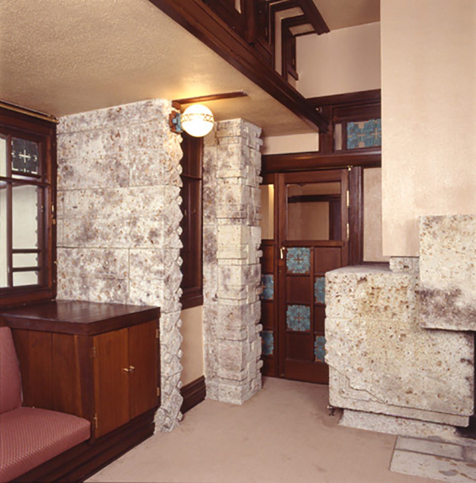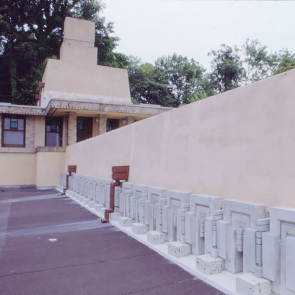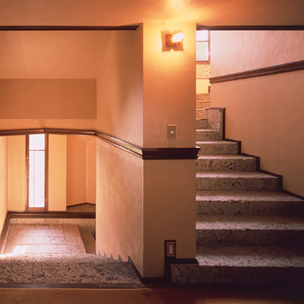 加工のしやすさに加え、自然の趣き深さが感じられる大谷石は、自然をテーマとしたライトの建築思想を表現するのにふさわしい石材だったといえます。もともと大谷石は耐火性に優れていることから、主に蔵や塀・門柱などに使われていましたが建築石材として内外装に多用したのは、ライトが最初とされています。当時(大正時代)もてはやされていた御影石ではなく、手垢のついていない大谷石を採用したところに、ライトのデザインに対するこだわりがあったといえるのではないでしょうか。
