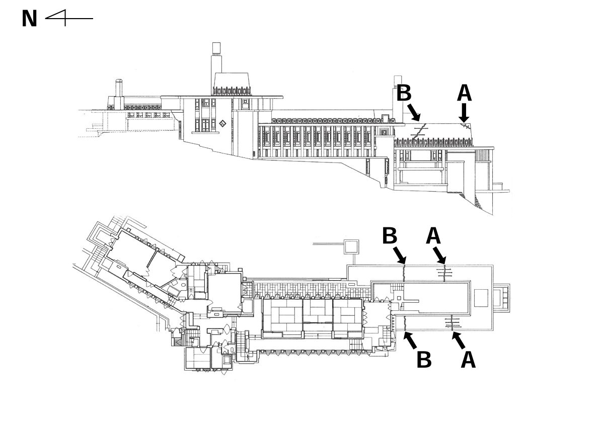 旧山邑家住宅のように急峻な崖地に迫り出した鉄筋コンクリート造の建築は、当時世界にもほとんど前例がなかったと思われるが、ライトは芦屋川左岸の景勝の地に構造的なリスクを覚悟の上で、敢えてこのような大胆な“り出し” 即ち“懸け造り”構造を考案したのではないかと想像される。しかしながら、鉄筋コンクリート造が生まれて間もない頃、地盤工学も未発達の時代にあって、あまりに斬新かつ独創的な造形に当時の構造技術が追従できなかったようだ。それ故、後の名作“落水荘”に通じる構造デザインの迫力に打たれるのである。