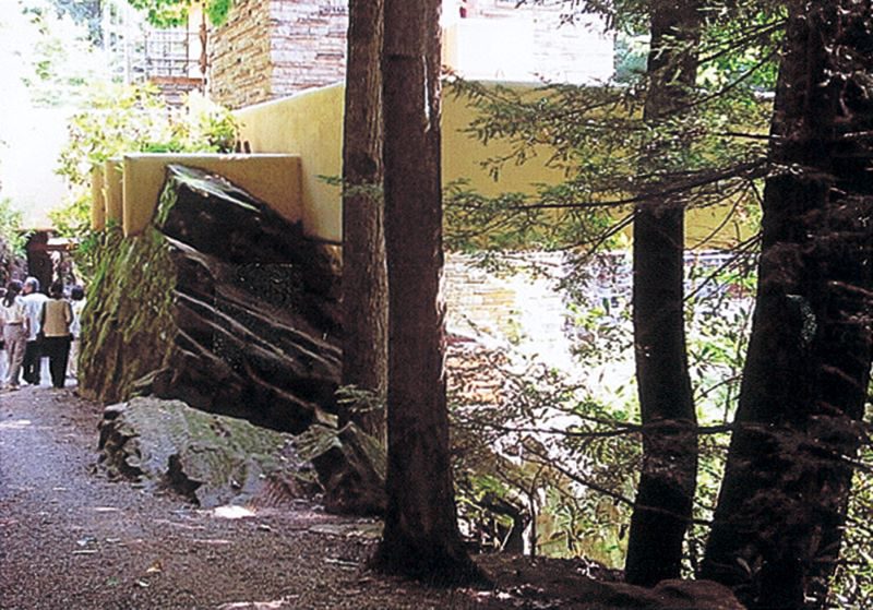 ところで、『落水荘』と言えば、立地が特徴的です。これについて興味深い話を伺いました。現地視察に訪れたライトが、カウフマン氏にお気に入りの場所を尋ねると、「滝の上の清流に頭を出している岩」と答えたそうです。そして、でき上がった建物は、誰もがまさかと思うものでした。なんと滝の真上に建てられ、しかもお気に入りの岩が建物の一部になるように設計されていたのです。
